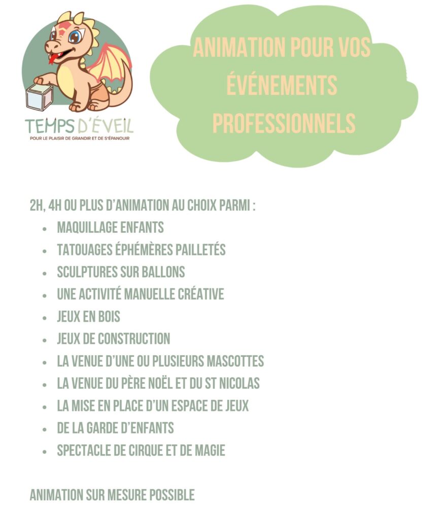 Aménagement d’un espace de jeux, garde d’enfants, animations maquillage enfants, sculptures de ballons, tatouages éphémères pailletés, atelier créatif, Père Noël, danse, spectacle de magie, etc.